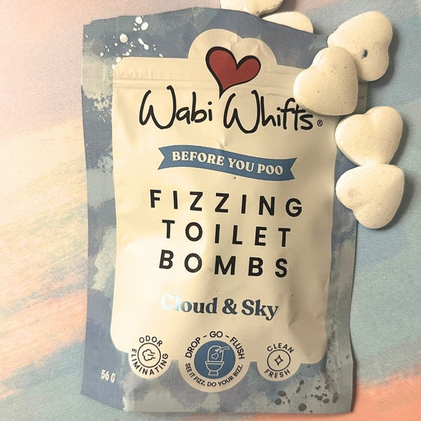 Have Confidence in Every Bathroom Moment and Be the Boss of Your No.2. Avoiding poo anxiety has never been easier. Wabi Whiffs heart-shaped toilet bombs feature biodegradable glitter, natural essential oils, and non-staining color. Made with baking soda, citric acid and fragrance oils, they fizz when dropped into the toilet before you poo, spreading a quick barrier over the water to eliminate odors. Bye-bye bathroom stress. Be fabulous. Be fragrant. Be fearless.