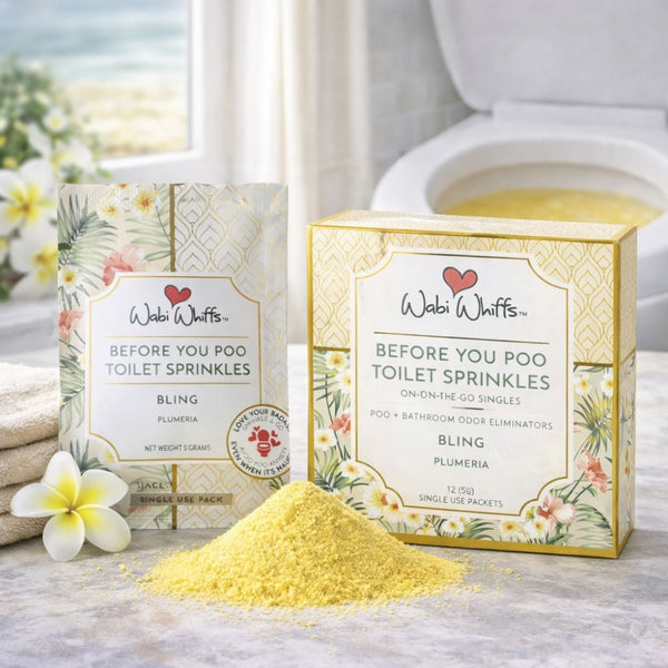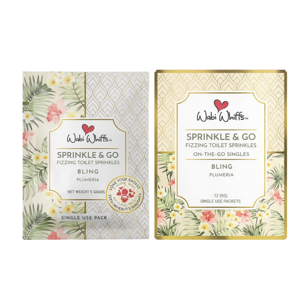 Pre-dosed colorful powders that contain natural essential oils and biodegradable glitter that fizz over the toilet bowl water creating a dome of protection trapping and eliminating odors from escaping. Perfect for being on the go! Convenient, discreet and easy to tear little pouches fit in your wallet, purse, pocket… everywhere!