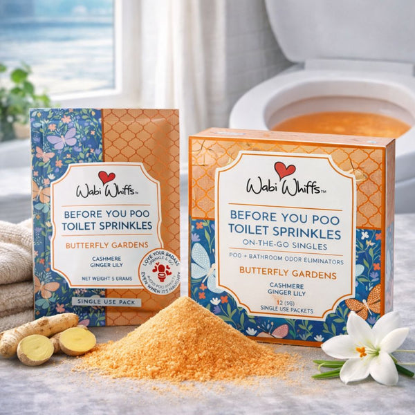 Pre-dosed colorful powders that contain natural essential oils and biodegradable glitter that fizz over the toilet bowl water creating a dome of protection trapping and eliminating odors from escaping. Perfect for being on the go! Convenient, discreet and easy to tear little pouches fit in your wallet, purse, pocket… everywhere!