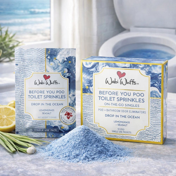 Pre-dosed colorful powders that contain natural essential oils and biodegradable glitter that fizz over the toilet bowl water creating a dome of protection trapping and eliminating odors from escaping. Perfect for being on the go! Convenient, discreet and easy to tear little pouches fit in your wallet, purse, pocket… everywhere!