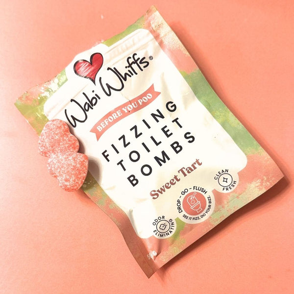 Have Confidence in Every Bathroom Moment and Be the Boss of Your No.2. Avoiding poo anxiety has never been easier. Wabi Whiffs heart-shaped toilet bombs feature biodegradable glitter, natural essential oils, and non-staining color. Made with baking soda, citric acid and fragrance oils, they fizz when dropped into the toilet before you poo, spreading a quick barrier over the water to eliminate odors. Bye-bye bathroom stress. Be fabulous. Be fragrant. Be fearless.